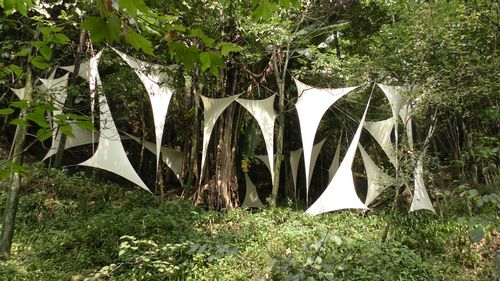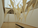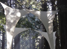 ‚Barre - Kathedrale des Lichts’, 2004, zum 2. Internationalen Waldkunstpfad Darmstadt, www.waldkunst.com Quer über den Pfad spannt sich ein filigranes Netzwerk weißer, spitzer Dreiecke. Wie ein weißer Wall liegt die Barre im Wald, kontrastierend in Farbe und Material. .. 2. Internationaler Waldkunstpfad, Darmstadt, 2004 /2