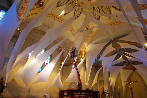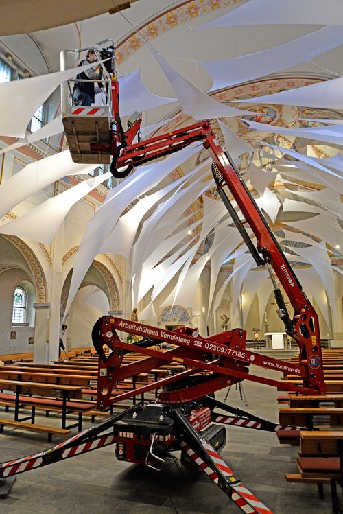 Aufbau der Installation Chuppa magna in der Kirche St. Maria Magdalena, Bochum Wattenscheid Höntrop. Sept 2015. Kunstmuseum Gelsenkirchen, neuer Ankauf