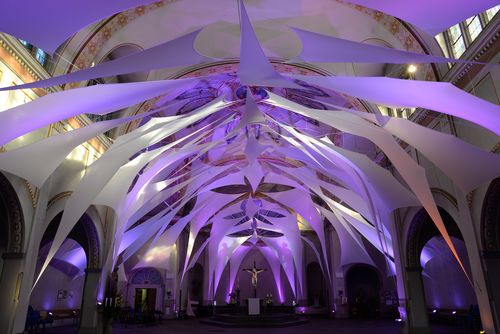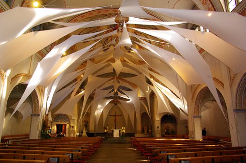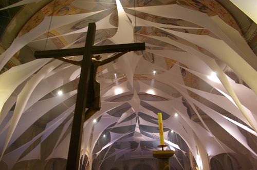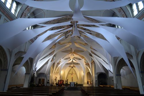 7 Pforten, in der Kirche St. Joseph.Die Tuchinstallation 7 Pforten greift die Geschichte der Kirche St. Joseph auf. Textile Tore formen die gotischen Spitzbögen der ursprünglichen Kirche (vor der Zerstörung der Kirche im 2. Weltkrieg) nach und machen sie temporär wieder sichtbar. Durch die Positionierung der Tore/Pforten wird die Kirche ‚dreischiffig‘, so dass auch dieser historische Aspekt wieder sichtbar wird. Finissage enfilade - vers la lumière