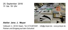 Offenes Atelier 2008 Jens J. MeyerWir freuen uns auf Ihren/euren Besuch Samstag 22. November Sonntag 23. November von 15 bis 19 Uhr Voßbusch 4, 45133 Essen, 0173/8574387, 0201558211 Anfahrt und parken auf dem ehem. Schulhof hinter dem Haus 'Mare' eine Ausstellung für Global Connect, Kroatien